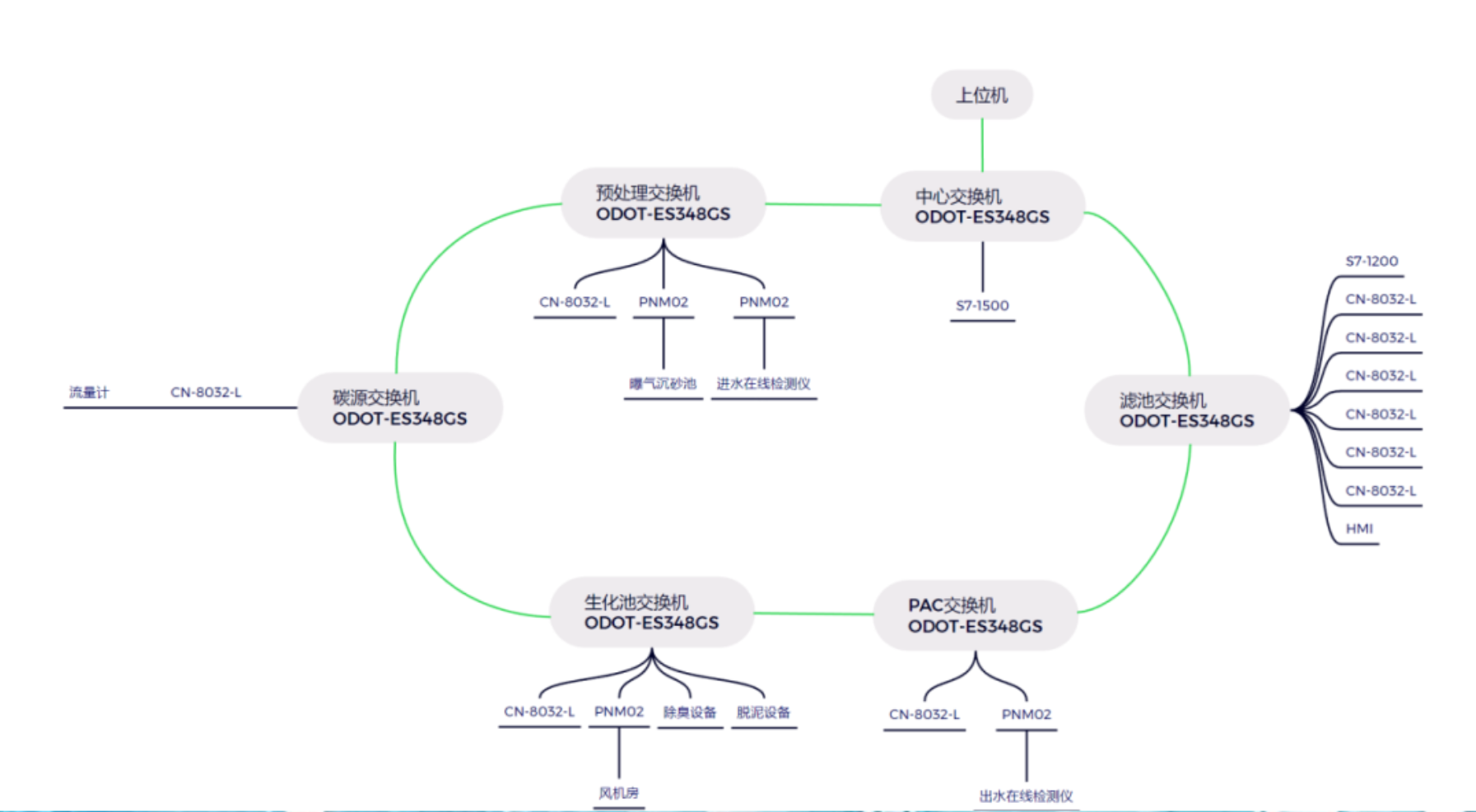本次服務的污水處理廠采用西門子1500作為主控PLC,設于中控室,并使用零點ES系列交換機搭建環網平臺,各個工藝段采用CN-8032-L模塊作為從站,通過IO實現工藝段的數據采集和控制,通過接入環網交換機,傳入PLC進行控制。